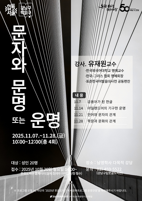 ‘문자와 문명 또는 운명’ 프로그램은 총 4회차로 구성되어, ‘공용어가 된 한글’, ‘아일랜드어(게일어)의 기구한 운명’, ‘언어와 문자’, ‘학문과 문화의 관계’라는 핵심 주제를 통해 인류 역사 속에서 언어와 문자가 담당한 역할을 살펴볼 예정이다.