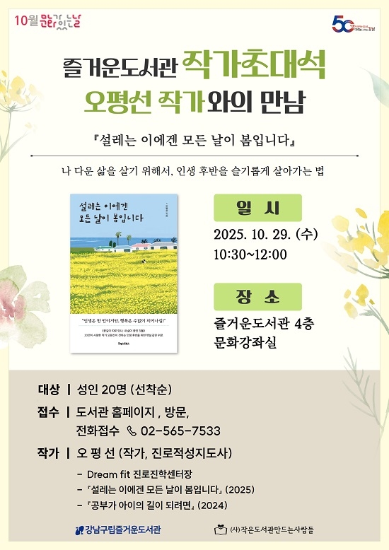 즐거운도서관에서는 2025년 10월 “즐거운도서관 작가초대석-오평선 작가와의 만남” 프로그램을 진행한다.