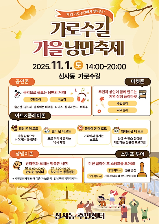 이태호 신사동장은 “가로수길 가을 낭만축제를 주민과 상인, 방문객이 함께 참여하는 은은하고 가을 감성 넘치는 지역축제로 만들겠다”며 “많은 분이 찾아오셔서 일상에 낭만을 더해주는 ‘작은 쉼표’를 발견하시길 바란다”고 말했다.