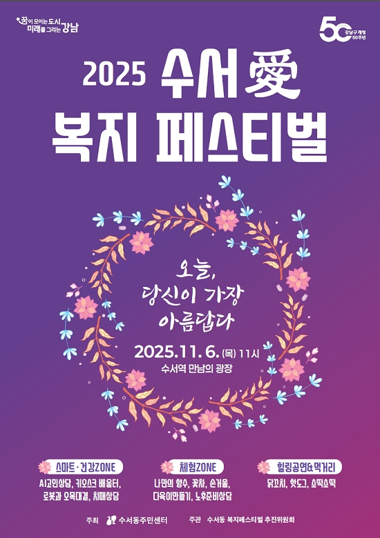 강남구(구청장 조성명) 수서동이 6일 수서역 만남의 광장(수서동 727)에서 ‘2025 수서愛 복지 페스티벌’을 개최한다.