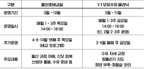 출산 준비 교실은 출산을 앞둔 임산부와 가족을 대상으로 출산 준비 전반을 다루는 프로그램으로, 3월부터 10월까지 매월 1·3주 목요일 오후 2시부터 4시까지 진행한다. 1:1 모유수유 클리닉은 모유수유에 어려움을 겪는 산모를 대상으로 전문 강사가 개별 상담을 제공하는 맞춤형 프로그램으로, 2월부터 11월까지 운영된다. 매월 1·3주 금요일 오후 2시부터 4시까지 진행한다.