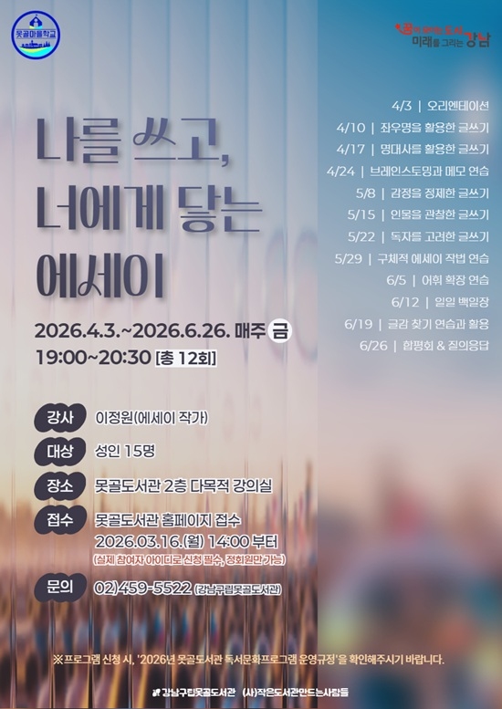 강남구립못골도서관(관장 이아영)은 ‘못골마을학교 제67회_나를 쓰고 너에게 닿는 에세이’ 프로그램을 오는 4월 3일(금)부터 운영한다.