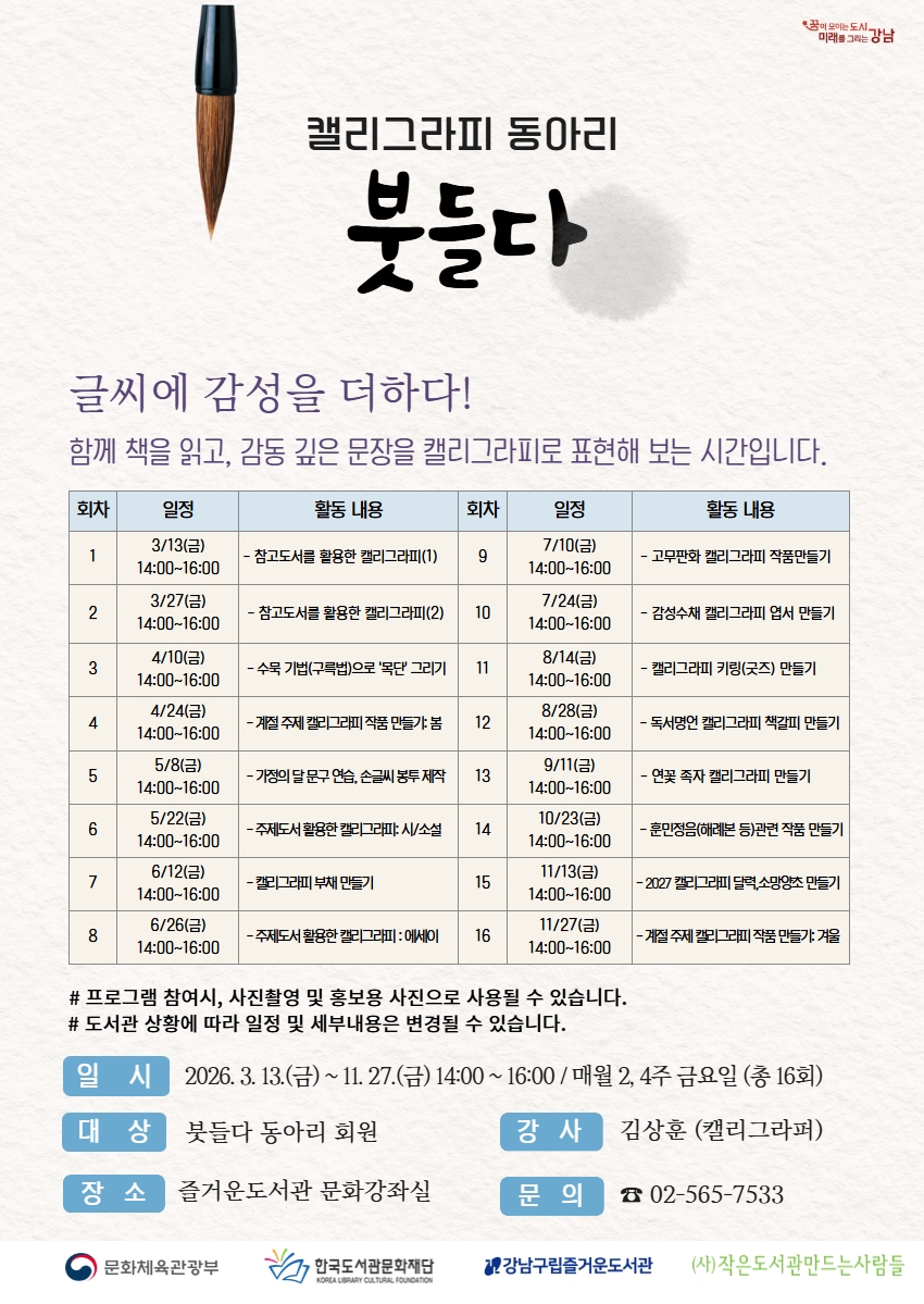 강남구립즐거운도서관(과장 김상희)은 문화체육관광부가 주최하고 한국도서관문화재단이 주관하는 ‘2026년 도서관 문화예술 동아리 활동 지원 사업’ 공모에 캘리그라피 동아리 ‘붓들다’가 선정됐다고 밝혔다.
