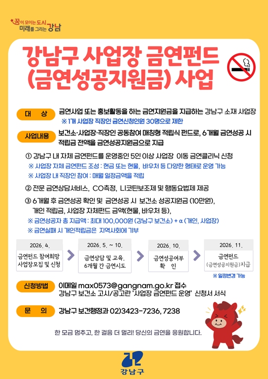 조성명 강남구청장은 “강남은 사업체와 직장인이 밀집한 지역이라 직장 내 금연 실천이 개인 건강뿐 아니라 간접흡연 피해를 줄이고 더 나은 근무환경을 만드는 데도 큰 의미가 있다”며 “사업장 금연펀드가 직장인의 금연 성공을 돕고, 기업과 보건소가 함께 만드는 건강한 조직문화를 확산하는 계기가 되길 바란다”고 밝혔다.